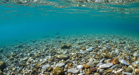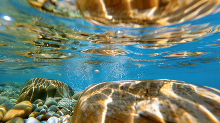 A stunning underwater view showcasing colorful pebbles resting on the ocean floor, illuminated by sunlight dancing across the water's surface, exuding tranquility.