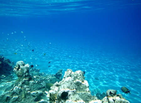 Fish, Sea sand and blue water. Underwater ocean background