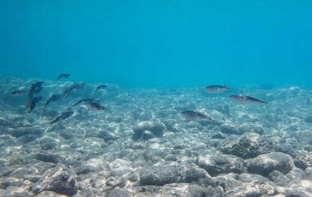 Underwater view with stones, reflection and blue sea water.