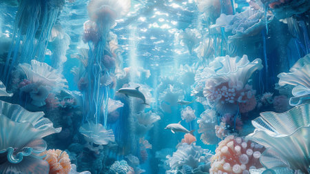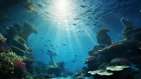 Aquatic paradise, vibrant coral reef illuminated by sunbeams, exploration of underwater ecosystem concept