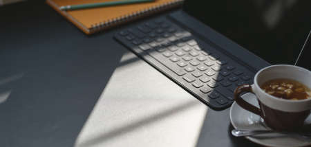 Top view of dark modern workplace with digital tablet, computer keyboard, coffee cup and copy space on black table