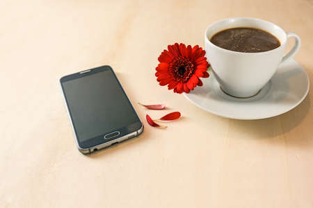 To call or not to call, cell phone, coffee cup and red flower with a few petals torn out on a light wooden background, love and dating concept, copy space, selected focus, narrow depth of field