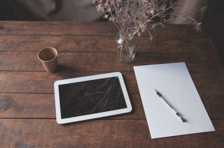 Modern office workplace with tablet pc on the table. On the table is a tablet computer with a sheet of white paper, dried flowers in a glass and a disposable cup of coffee.