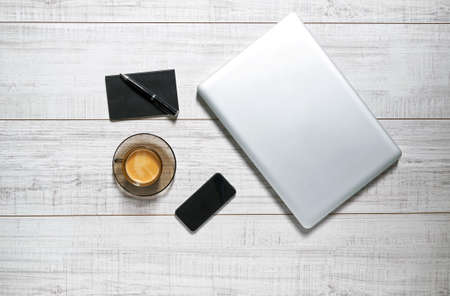 Simple office workspace with notebook laptop computer, notebooks, coffee cup and copy space. flat