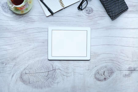 Tablet computer with coffee and equipment office on isolated.Top view