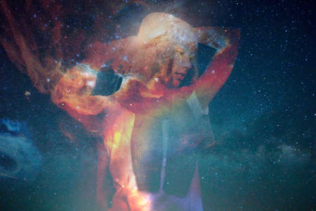 Beautiful young woman on the amazing starry sky, double exposure concept. Feminine image and creative thoughts. think differently. Galaxy and Milky Way