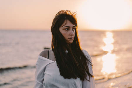 long-haired blonde woman dressed in white, enjoying the sea breeze by the sea with her eyes closed and arms outstretched, receiving the last sun rays of the day.