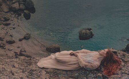 beautiful young girl in the morning under the water. Mysterious Woman in White Dress, vintage filter