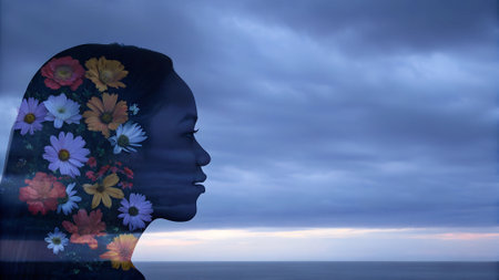 Double exposure of a woman with floral patterns against a cloudy sky. Serenity and self-reflection concept