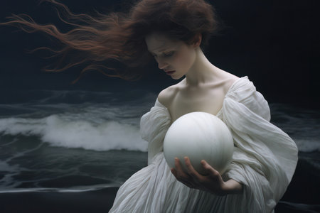 A woman is depicted wading through water, possibly the ocean. She is wearing a dress, with her back to the viewer. The image features a dark and moody atmosphere, with sunlight breaking through the clouds. This image is suitable for various commercial uses, including artistic and conceptual projects.