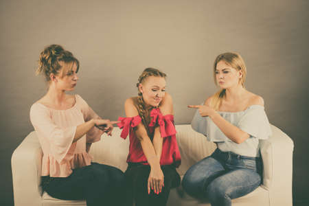 Woman being bullied by her two female friends. Females pointing blaming at friend. Friendship rivaly and envy problems.