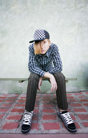 Teenage boy with crazy hair and a clothes on a green bench.