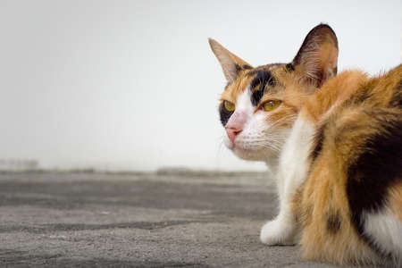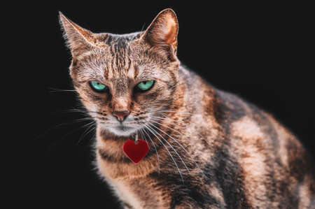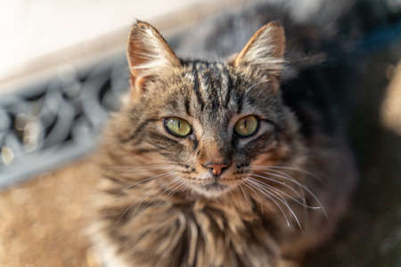 Curious cat looks into the camera. Pet in bright daylight. Kitten with colored fur and a cute muzzle. Domestic animals theme. Close up and copy space.