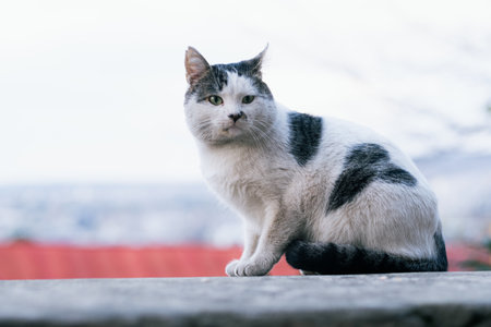 White and Black Cat Sitting on Outdoor Wall. Homeless dirty kitten with battered ear sits sadly on the street.