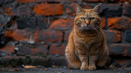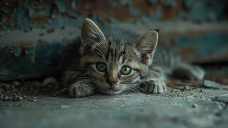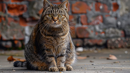 A solitary stray cat sits in a cluttered urban alley, surrounded by debris and soft light, showcasing its detailed fur and expressive eyes, embodying resilience.