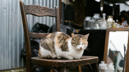 a calico cat is peacefully napping on an old wooden chair at an outdoor flea market, creating a serene and cozy scene in the bustling market