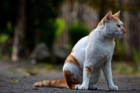 Beautiful cat sitting on the dilapidated bench by the abandoned house asking for food