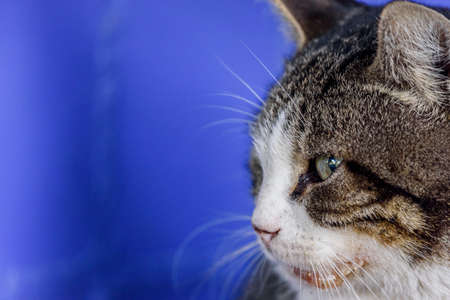 Photo of domestic cat (pet) in closed plan, with a fixed and cute look. Real animal in a real situation.