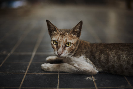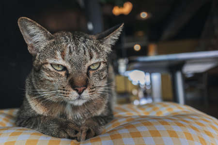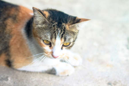 Cranky cat sleeping on the sidewalk in the morning in vintage tone.