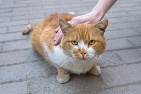 Domestic life with pet outdoors. Playful striped cat welcome his owner at garden Scene captures tender bond between pet and owner in natural. Tabby ginger cat greeting with his owner on tiles floor.