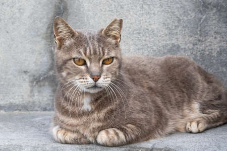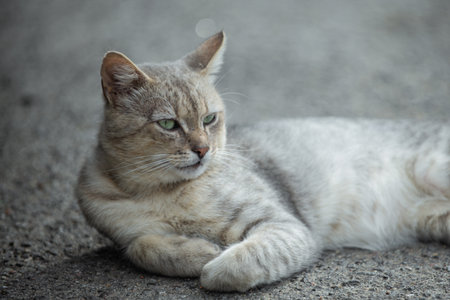 portrait of a gray cat lays on gray asphalt. vertical shot