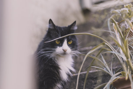 Black and white cat looking aside. Young Greek domestic cat in her backyard.