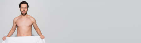 amazed shirtless man holding white blanket while looking at camera on grey, banner