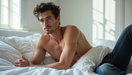A handsome young man with tousled hair reclines on a bed, exuding a relaxed yet contemplative vibe. The soft morning light filters through the window, creating a serene atmosphere that invites introspection and calm