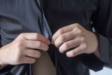 The young man is getting dressed.The concept of fashionable clothing is a close-up of a man getting dressed and buttoning a black shirt