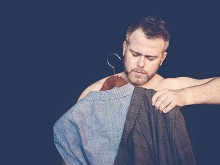 An attractive bearded naked man holds a wooden hanger with two jackets in his hands. The guy chooses what to wear and looks at clothes