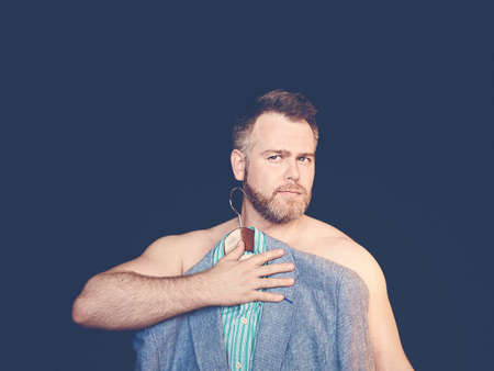 Fat man does not wear a shirt,overweight man trying on cloth ,on white backgroun, copy space