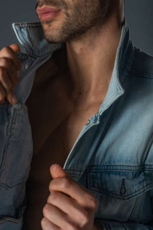 Picture of a young handsome macho man with abs and open denim jacket and jeans.