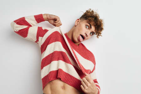 Sexy sensual young woman. Flirting dating romantic seduction girl moving her shirt.
