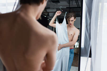 young transgender man with makeup holding hanger with slip dress and looking at mirror