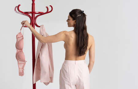 England UK. 2021. Woman getting dressed in pink, bra, jacket by a clothes stand.