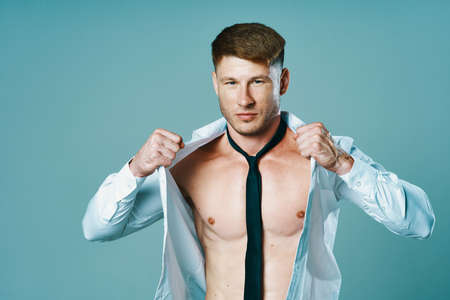 Man ripping open his shirt showing chest and naked torso, Man tearing off his shirt yelling with strong expression