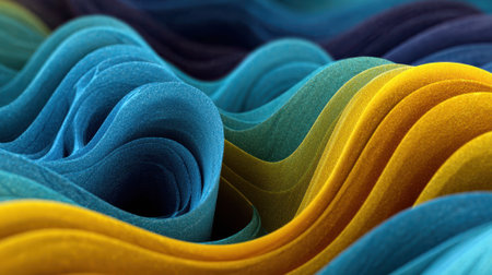 Colorful abstract pattern with flowing wavy shapes in shades of blue, teal, and yellow. The vibrant design features layered curves with a smooth, textured appearance, depicting a sense of motion