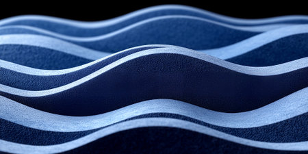 This artistic rendering displays an abstract landscape of undulating, wave-like forms, primarily in rich shades of blue. The scene is characterized by rhythmic peaks and valleys that create a strong sense of dynamic movement and flow. Fine, textured details enhance the depth and suggest a layered or granular construction, contributing to the visual interest of the blue gradient transitions. This versatile backdrop evokes deep ocean currents, topographical patterns, or advanced digital data visualizations. It provides a modern, serene, yet powerfully aesthetic foundation for many creative projects.