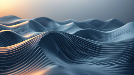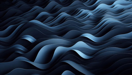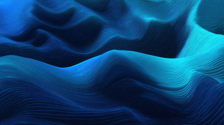This artistic rendering displays an abstract landscape of undulating, wave-like forms, primarily in rich shades of blue. The scene is characterized by rhythmic peaks and valleys that create a strong sense of dynamic movement and flow. Fine, textured details enhance the depth and suggest a layered or granular construction, contributing to the visual interest of the blue gradient transitions. This versatile backdrop evokes deep ocean currents, topographical patterns, or advanced digital data visualizations. It provides a modern, serene, yet powerfully aesthetic foundation for many creative projects.