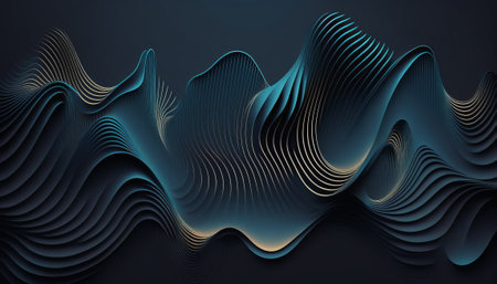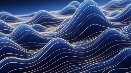 Abstract 3d rendering of wavy blue background with golden lines.