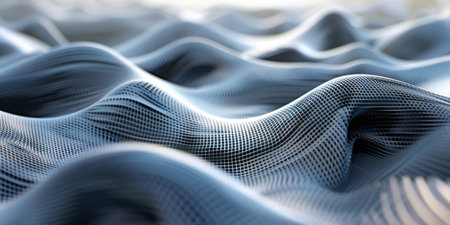 Abstract nanotechnology pattern of flowing blue waves with light shimmering across the surface, showing fine detail and structure..