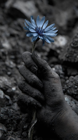 A hand delicately holds a single blue flower against a stark grayscale backdrop. The contrast highlights the flower's vibrant color and delicate petals. The composition features a shallow depth of field, emphasizing the subject's texture and form. This image could be used for various purposes, including editorial and commercial projects.