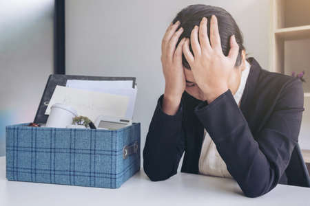 Stressed businessman receive fired letter from employer and packing belongings and files into brown cardboard box, changing and resigning from work concept.