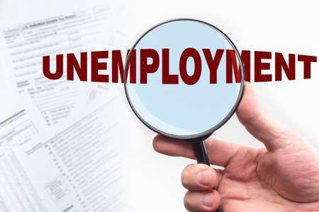 Unemployment. A person under a magnifying glass examines the word Unemployment. Studies of the labor market. The reasons for the staff reductions. Availability of vacancies.