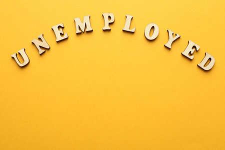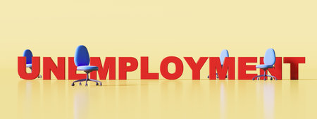 Red unemployment lettering on yellow background, empty armchairs. Concept of crisis and job search. 3D rendering