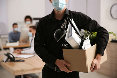 Depressed and upset office worker gathering personal belongings because of job dismissal. Young adult left unemployed because of company unsuccessful financial recovery plan.