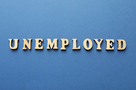 UNEMPLOYMENT letters and coins on business concept on gray background. Banner. Copy space.