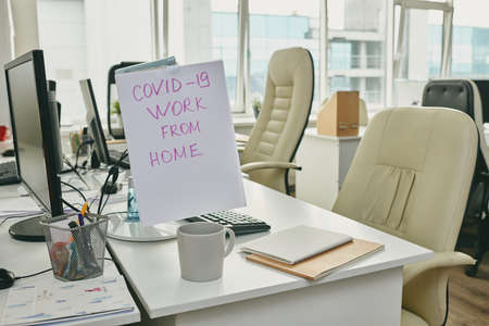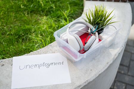A box of personal items from the desktop of an office employee and an unemployment sign. Unemployment and the economic crisis during the spread of coronavirus infection.