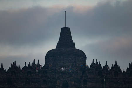 Borobudur temple, Indonesia - July 18, 2019: Tourists photographing the sunrise, thanks to which the silhouettes of the stupas and the surrounding landscape begin to be glimpsed.