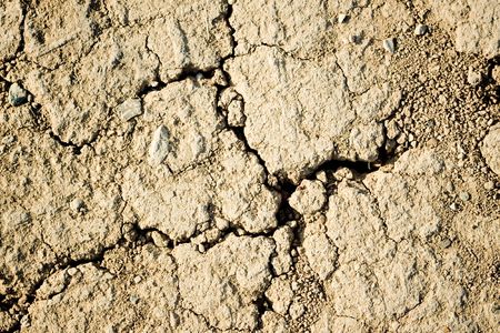 Cracked sandy soil surface. Drought broken ground earth.